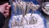 Der Stint wird gesalzen und gepfeffert in Roggenmehl gewendet. Falls kein Roggenmehl vorhanden ist kann auch normales Weizenmehl genommen werden. Danach ziehen wir den Stint auf Schahschlickspieße. Mit dieser Methode lassen sich gleich mehrere Stinte bequem in der Pfanne wenden und werden so gleichmäßig gar gebraten. |