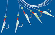 Drei prachtvolle Stinte an der Angel (Foto). Außergewöhnlich ist der Geruch der Stinte, der nicht nach Fisch riecht, sondern lecker nach frischen Gurken. Zum fang dieser Fische werden Herings-Hakensysteme (Paternoster) mit nicht mehr als 2 Haken genommen (seit 2009 2 Haken - das Foto links ist älter) . Um die Fängigkeit zu erhöhen, sind die Haken mit künstlicher Fischhaut, Perlen und Federn verziert. Das Senken ist zu dieser Zeit nicht erlaubt. |