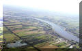 Luftaufnahme der Elbe bei den Ortschaften Wraust, Howe und dem Angelsee. Die Ortschaft Fliegenberg rechte Bildseite. |