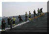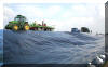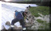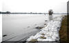 Die Planen sollen den Deich gegen Ausschwemmungen und Aufweichen schützen. Mit Sandsäcken werden die Planen verstärkt. Auch DLRG-Rettungstaucher schützten den Deich durch das wasserseitige verlegen und sichern von Folien. |