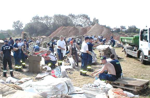 August 2002 - THW, Feuerwehr und zahlreiche Helfer beim befüllen von Sandsäcken für die Deichverstärkung und Häuserschutz in der Altstadt. |
