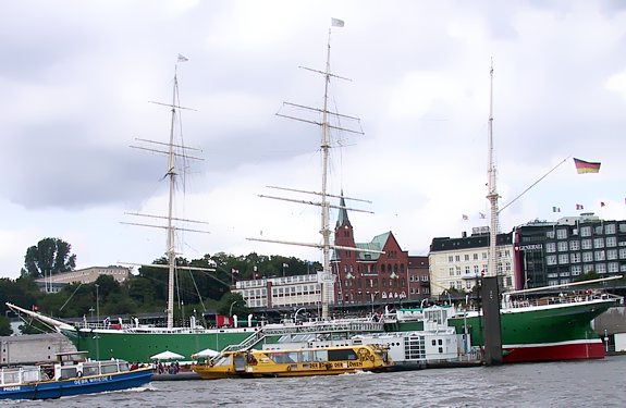 Ein weiteres schwimmendes Wahrzeichen Hamburgs, ist das Museumsschiff "Rickmer Rickmers". Es wurde 1896 als Vollschiff aus Stahl in Bremerhaven gebaut und ist zuletzt als Schulschiff gefahren. Seit 1987 ist es als Museumsschiff zur täglichen Besichtigung freigegeben. Die umfangreiche Geschichte und vieles mehr, erhalten sie unter der Homepage www.rickmer-rickmers.de . |
