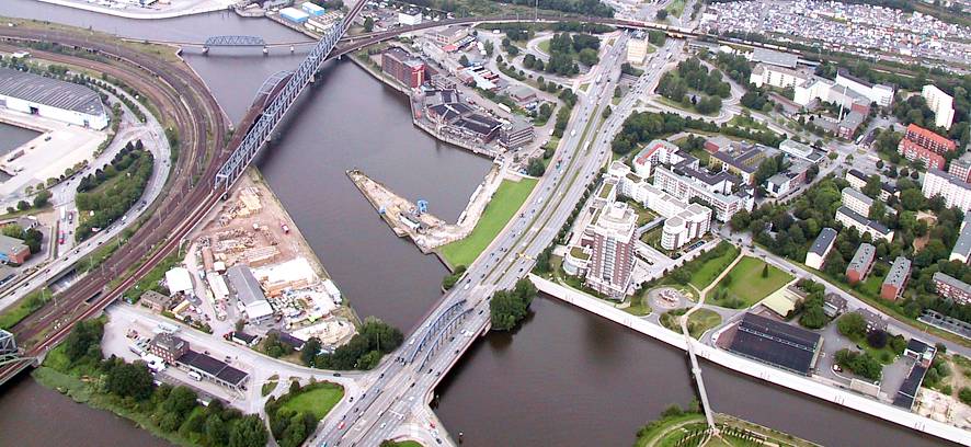 In der Mitte des Bildes befindet sich der Billhafen. Etwas weiter rechts - die Billhorner Brückenstraße. Im linken, oberen Bildteil befindet sich der Oberhafen und der Baakenhafen. |
