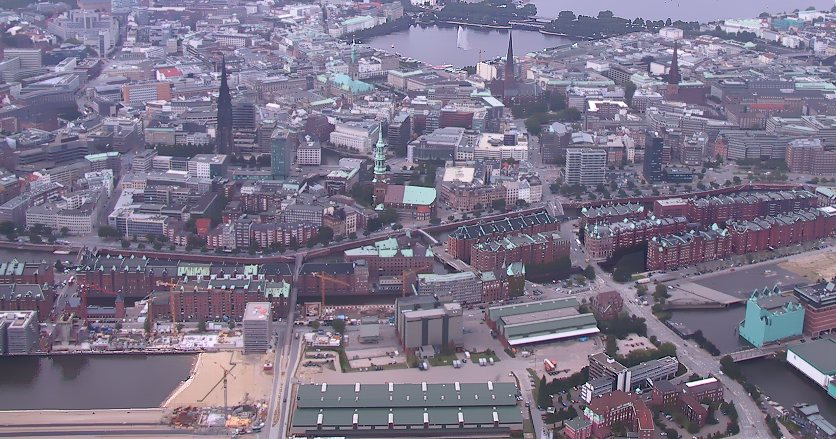 Die 1883 bis 1912 errichtete Speicherstadt in der Mitte des Bildes. Der einzigartige größte Lagerhauskomplex der Welt besteht aus 22 Speicherblöcken und wird heute noch benutzt (detaillierte Infos - siehe weiterführende Links). |