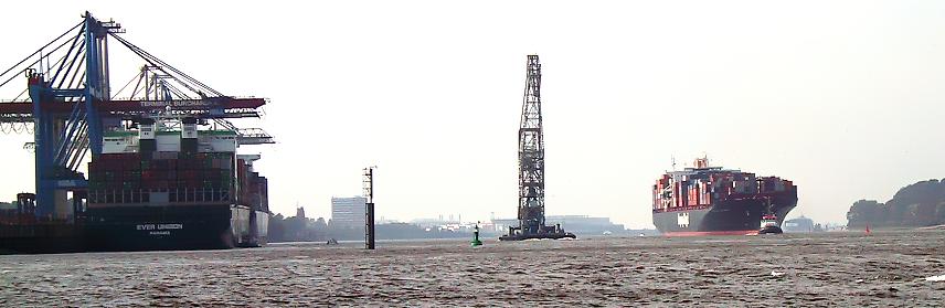 Containerschiff wird beladen (Bild links). Schwimmkran auf dem Weg zum Einsatzort (Bildmitte). Containerschiff mit Fracht wird zur Anlegestelle geschleppt (rechte Bildhälfte). |