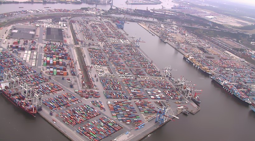 Waltershof mit den Containerumschlagplatz der Hamburger Hafen- und Lagerhaus AG (HHLA). Tag und Nacht werden hier Container umgesetzt die vorher vom Zoll mit Röntgenstrahlen auf Schmuggelware und Drogen geprüft werden. 60m hohe Containerbrücken können pro Stunde 25 Container zwischen Schiff und Land bewegen. Der Containerterminal Waltershof ist voll computergesteuert. Bereits während der Einfahrt der Schiffe in die Elbmündung werden Details der Ladung nach Hamburg durchgegeben und ein Entlade,- Lagerungs,- und Beladeplan für die zu bewegenden Container erstellt. Hamburg ist der größte Containerumschlagplatz Europas |
