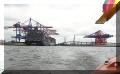 Waltershof mit den Containerumschlagplatz der Hamburger Hafen- und Lagerhaus AG (HHLA). Tag und Nacht werden hier Container umgesetzt die vorher vom Zoll mit Röntgenstrahlen auf Schmuggelware und Drogen geprüft werden. 60m hohe Containerbrücken können pro Stunde 25 Container zwischen Schiff und Land bewegen. Der Containerterminal Waltershof ist voll computergesteuert. Bereits während der Einfahrt der Schiffe in die Elbmündung werden Details der Ladung nach Hamburg durchgegeben und ein Entlade,- Lagerungs,- und Beladeplan für die zu bewegenden Container erstellt. Hamburg ist der größte Containerumschlagplatz Europas. |