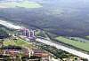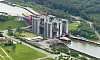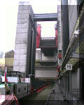 | Auf dem Foto ist etwa in der Bildmitte das Ziel des Hebevorgangs zu erkennen. Das Hebewerk benötigt ca. 15 bis 20 Min. mit Ein- und Ausfahrt der Boote, um die 38 Meter Höhenunterschied zu überwinden. | ||