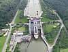 | Einfahrt in den linken Trog des Hebewerks. Jeder Trog hat ein Gewicht von 5800 Tonnen und ist für die Beförderung moderne Frachtschiffe geeignet. | ||