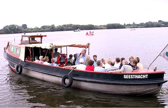Vorstandsmitglied des Fremdenverkehrsvereins Grünhof-Tesperhude Hans-Peter Gatermann und Bernd Goerke (in der Bildmitte stehend) kommentierten die Fahrt und zeigten den Gästen die wunderbare Flusslandschaft mit dem "Hohen Elbufer" von Tesperhude, Krümmel und Geesthacht. |