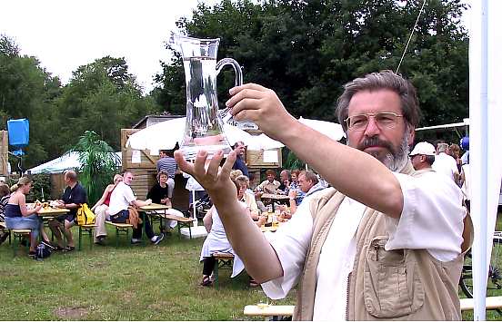 Auf dem Foto Olaf Martelock (im Vorstand des Fremdenverkehrsvereins Grünhof-Tesperhude) mit einem Kelch voll klares Elbewasser aus der Quelle. |