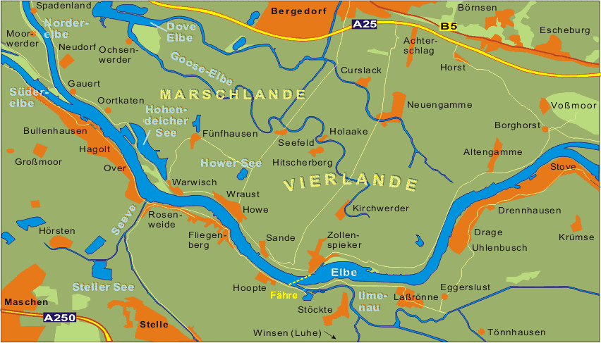 = höher liegendes Gebiet     = Flachland, Ebene