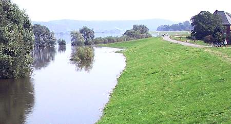 Elbedeich bei Marschacht während der Hochwasserkatastrophe August 2002. Das Deichvorland (die Aue), wie auf dem Foto zu sehen ist, wurde schon völlig vom Hochwasser überflutet. Weil der Wasserstand nicht weiter steigt, ist die Überflutung des Deiches nicht zu befürchten. Bei dauerhaften Hochwasserstand kann der Deich jedoch durchweichen, Wasser kann durchsickern und den Deich dadurch instabil machen. Der Deich muss ständig überwacht werden damit nach Anzeichen einer Schädigung sofort mit Deichschutzmaßnahmen begonnen werden kann. Besonders beim Austritt von trübem Sickerwasser (Materialaustrag), sind Deichverteidigungsmaßnahmen unter der Führung von sachkundigen Personen einzuleiten. |